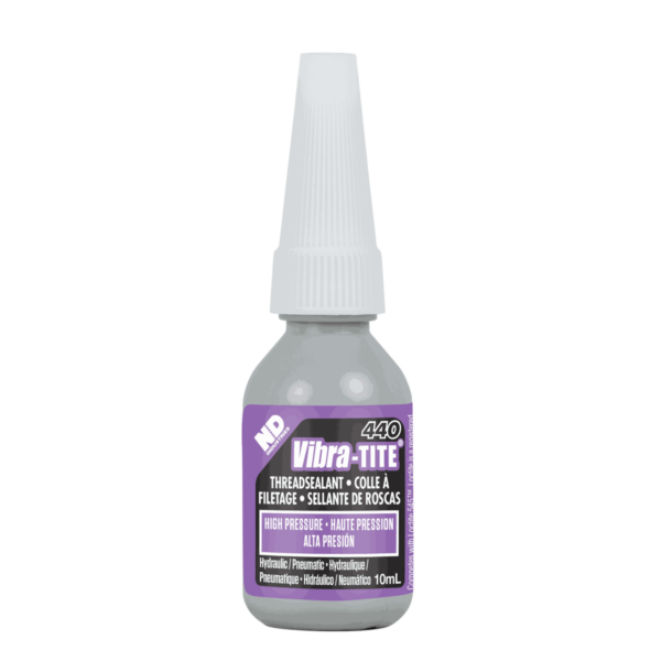 Герметик средней степени прочности для металлических труб и фитингов гидравлических систем. Рассчитан для систем высокого давления. Эффективно фиксирует и герметизирует металлическую резьбу трубных соединений. Продукт наносится на резьбу в жидком виде. В зазоре между металлическими поверхностями без доступа воздуха он отверждается (анаэробно) в термостабильный полимер, который фиксирует и заполняя зазор между фитингами герметизирует их. Vibra-tite 440 является тиксотропным, что исключает растекание продукта по поверхности после нанесения, используется в основном, в гидравлических системах, стоек к различным растворителям.