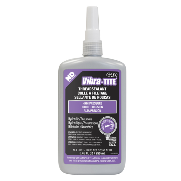 Герметик средней степени прочности для металлических труб и фитингов гидравлических систем. Рассчитан для систем высокого давления. Эффективно фиксирует и герметизирует металлическую резьбу трубных соединений. Продукт наносится на резьбу в жидком виде. В зазоре между металлическими поверхностями без доступа воздуха он отверждается (анаэробно) в термостабильный полимер, который фиксирует и заполняя зазор между фитингами герметизирует их. Vibra-tite 440 является тиксотропным, что исключает растекание продукта по поверхности после нанесения, используется в основном, в гидравлических системах, стоек к различным растворителям.