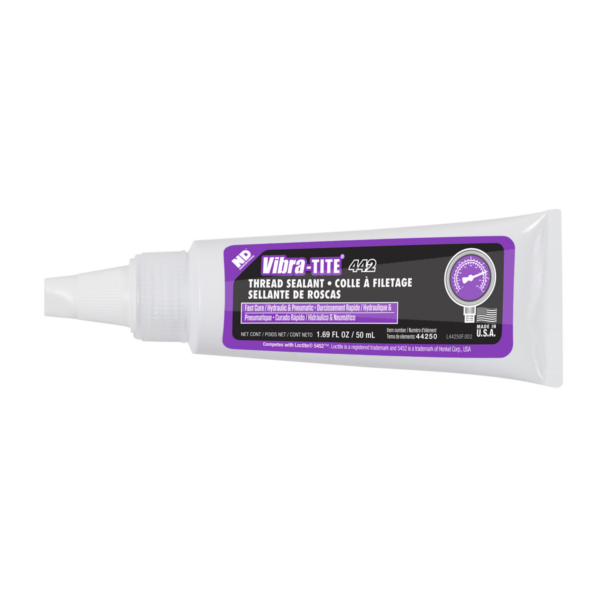 Анаэробный герметик для металлических труб и фитингов. Применим в гидравлических и пневматических системах работающих при больших нагрузках и вибрации. Продукт отверждается в небольших зазорах между металлическими поверхностями без доступа воздуха. Отвердевший продукт представляет собой термостабильный полимер с хорошей адгезией к металлам. Vibra-tite 442 обладает низкой прочностью и при необходимости может быть демонтирован.