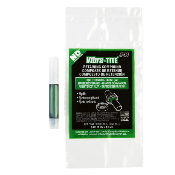 Однокомпонентный клей для цилиндрических соединений (вал-втулочный фиксатор). Vibra-tite 541 полимеризуется в небольшом зазоре между металлическими поверхностями без доступа воздуха (анаэробно). Отверждённый продукт представляет собой упрочненный термостабильный пластик, который полностью заполняет зазор между деталями, включая все микронеровности, тем самым крутящий момент передаёт 100% поверхности сопрягаемых деталей.