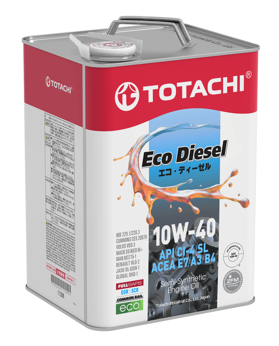 TOTACHI Eco Diesel 10W-40 – полусинтетическое моторное масло для дизельных двигателей тяжелонагруженной техники. Обеспечивает максимальную эффективность диспергирования сажи и превосходную защиту от износа двигателей магистральной и внедорожной техники, а также другой техники, требующей моторного масла с категориями 10W40 API CI-4/SL или ACEA A3/B4/E7 или JASO DL-0/DH-1. Продукт отвечает строгим требованиям большинства производителей современных и более ранних двигателей грузовиков, автобусов, строительной, сельскохозяйственной и горнодобывающей техники, генераторов, двигателей рыболовных судов а также другой техники, оснащенной системами рециркуляции выхлопных газов (EGR) и системами SCR NOx. Способствует увеличению срока службы двигателя и его отдельных частей. Идеально подходит для смешанных парков техники, где присутствуют двигатели различных марок.
