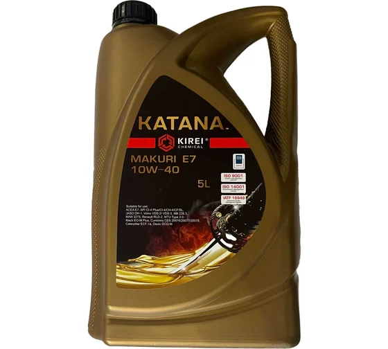 KATANA Makuri E7 10W-40 – универсальное моторное масло класса SHPD (Super High Performance Diesel), выпущенное по синтетической технологии, для использования в тяжелонагруженных дизельных двигателях (турбированных и нет) современных грузовых автомобилей, автобусов, сельско-хозяйственной, дорожно-строительной и другой спецтехники.