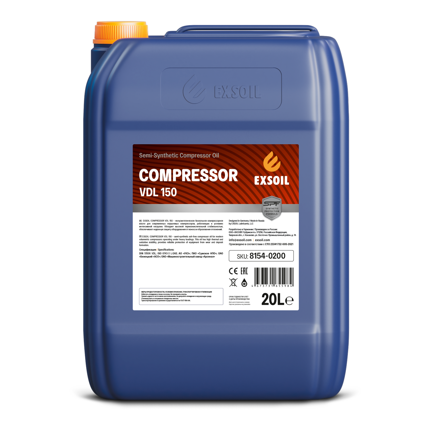 EXSOIL COMPRESSOR VDL 150 – полусинтетическое беззольное компрессорное масло для современных поршневых компрессоров, работающих в условиях интенсивной нагрузки. Обладает высокой термоокислительной стабильностью, обеспечивает надежную защиту оборудования от износа и образования отложений.