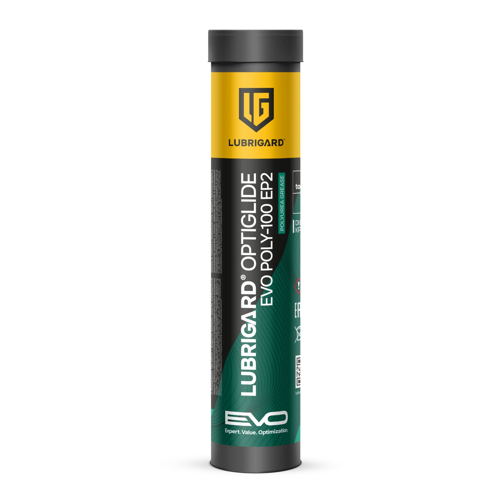 LUBRIGARD OPTIGLIDE EVO POLY-100 EP2 - высокотехнологичная пластичная смазка, разработанная на основе тщательно отобранного минерального масла, полимочевинного загустителя и сбалансированного пакета присадок, включающего компоненты для работы при экстремальном давлении (EP).
